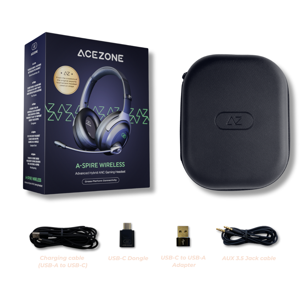 The AceZone A-Spire Wireless is designed with seamless cross-platform connectivity in mind. Inside the package, you'll discover a premium hard carry case housing the A-Spire Wireless gaming headset, alongside an AUX 3.5 Jack Cable and a USB-A to USB-C Charging Cable. Additionally, it includes a USB-C dongle, enabling endless hours of wireless gaming convenience. Lastly it comes with a USB-C to USB-A adapter for the dongle.